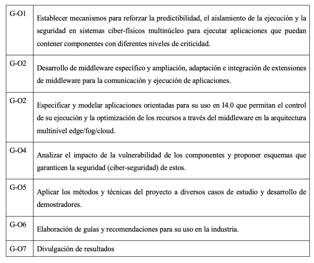 «El objetivo general del proyecto es contribuir a la digitalización industrial facilitando el desarrollo de sistemas informáticos industriales predecibles, fiables y seguros mediante el desarrollo y/o la integración de modelos, middleware y plataformas específicas.».